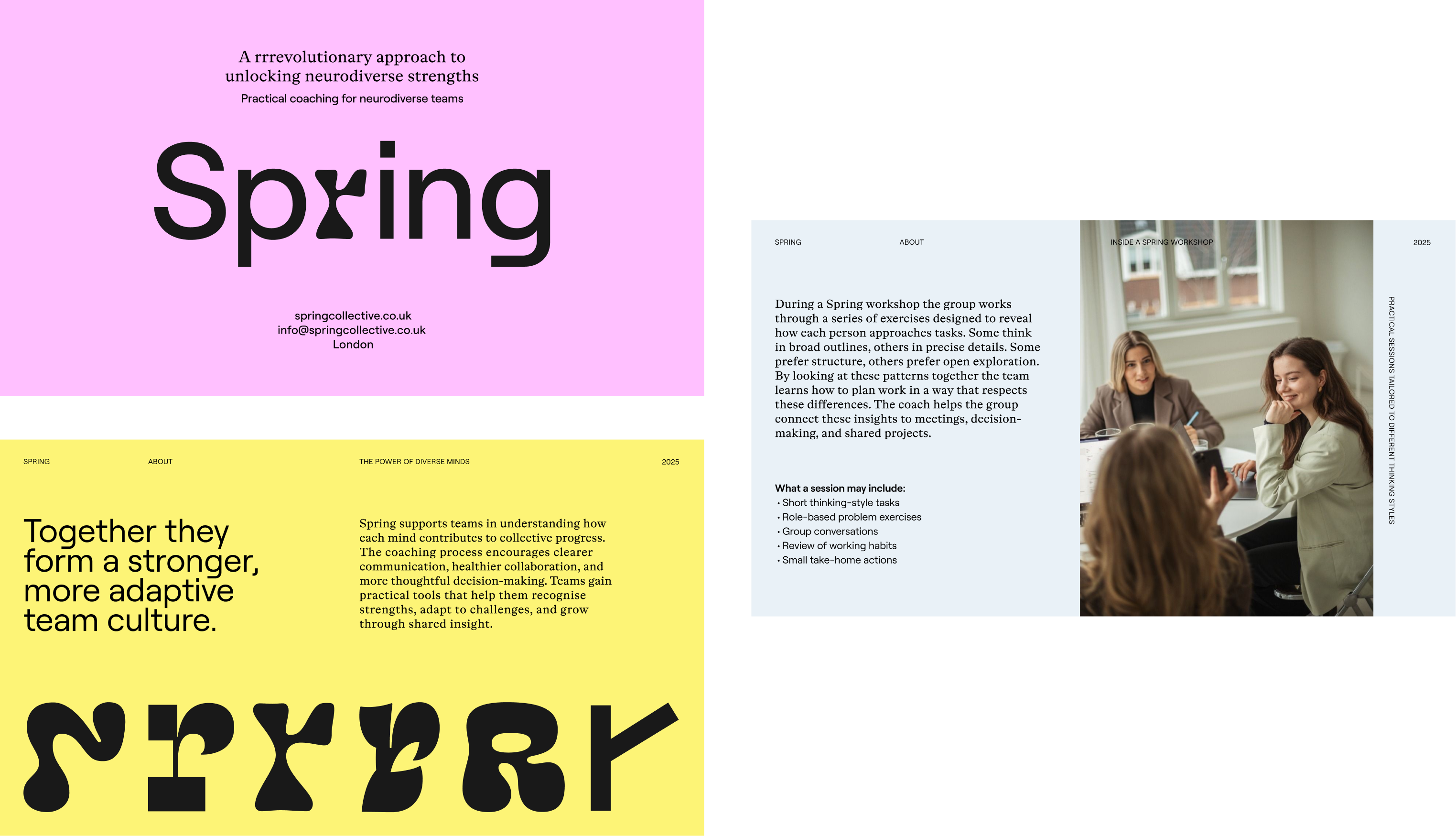 The concept sees difference as an essential part of how people think, learn, and create together. We mapped ideas around flexibility, release, things that unfold. Spring emerged as the name. A coil that releases energy. A season of renewal. Potential being revealed.